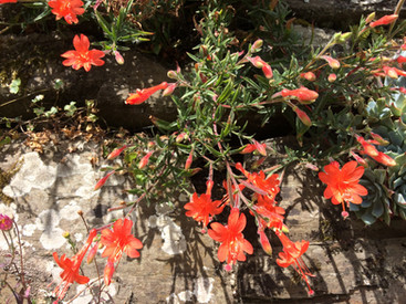 Arrive, park and then check in at the visitors centre. Turn right and walk through a narrow pathway surrounded by Camellia and a large Butia palm to a huge open lawn to the South and a raised bed to the North. The Valley view is spectacular , with views all the way to the sea. The raised beds feature a couple of massive Agave (Agave gentryi) and a stunning example of the spiral aloe (Aloe polyphylla). Cascading over the raised succulent bed is the dainty Zauschneria californica, with it’s charming red fuchsia like flowers . To the south of the high formal path are giant tree ferns. Legend has it that these massive Dicksonia antarctica arrived at Trebah as ballast in returning trading ships from Tasmania in the 1860’s , if true, this makes many of the biggest examples well over 200 years old.